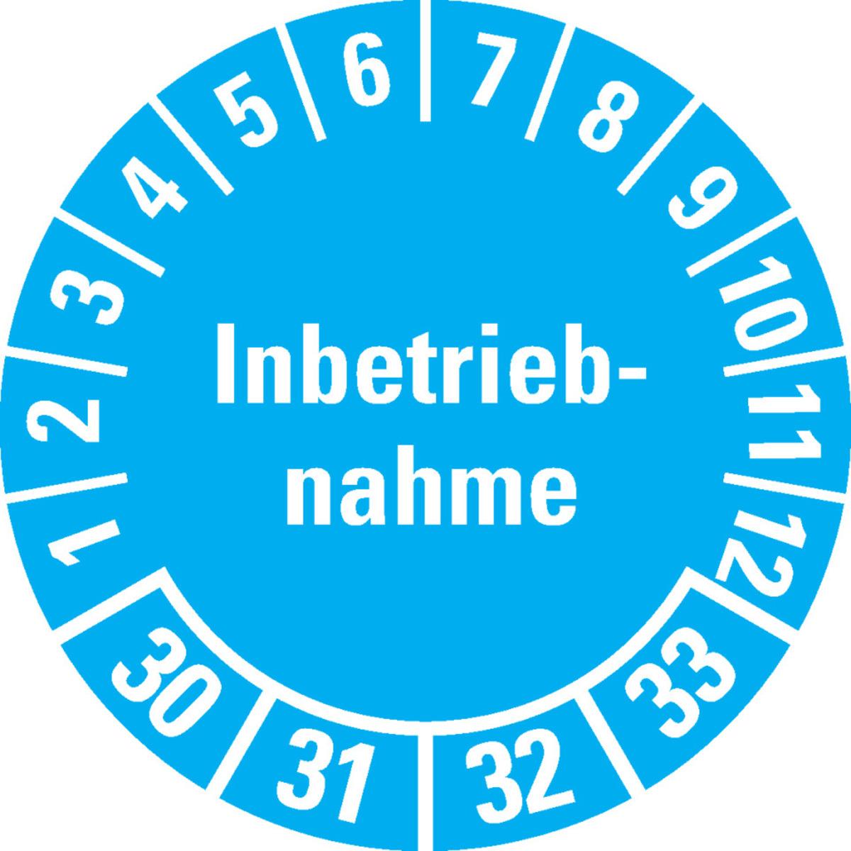 Mehrjahresprüfplakette "Inbetriebnahme" zur Einhaltung von Prüffristen und Erleichterung der Terminkontrolle.