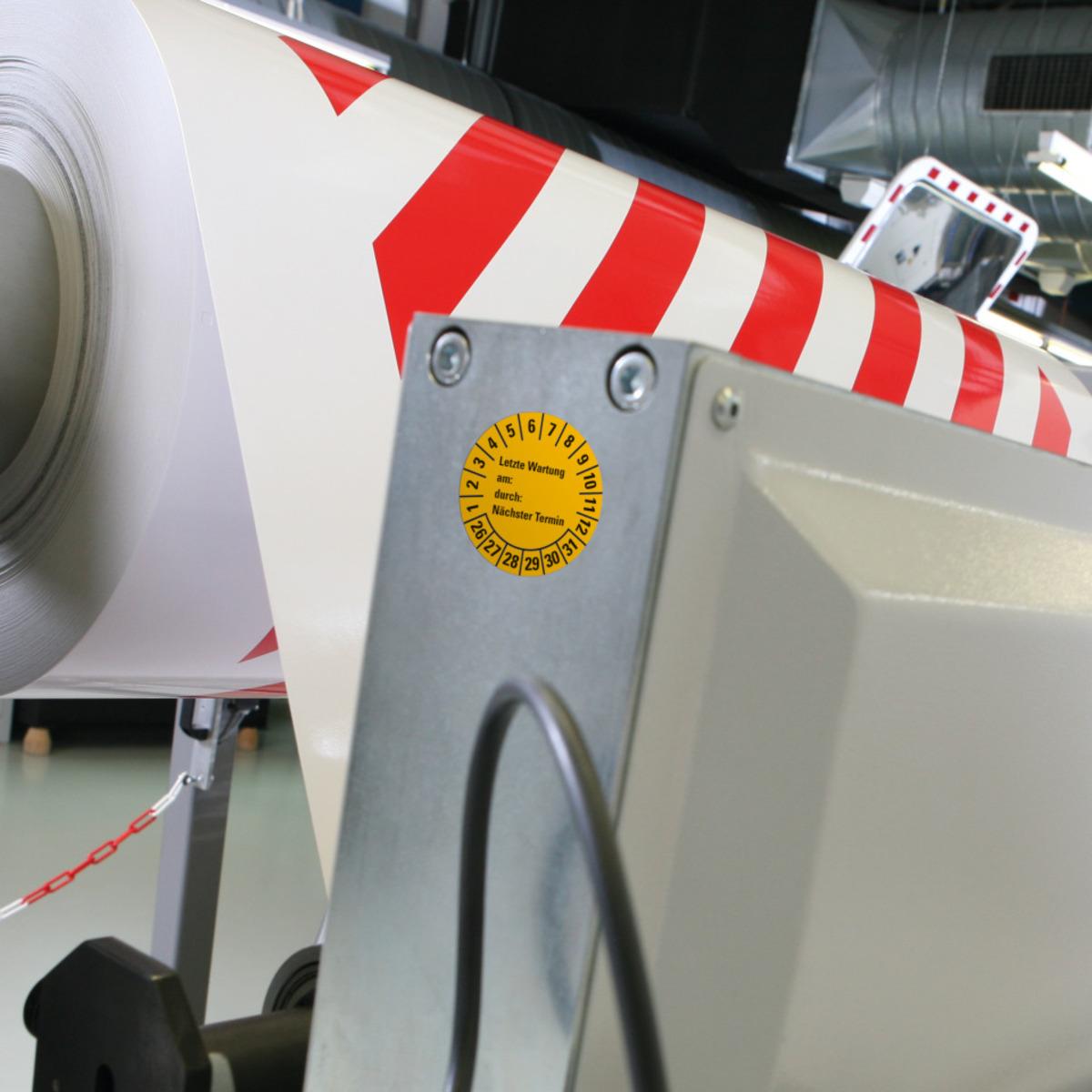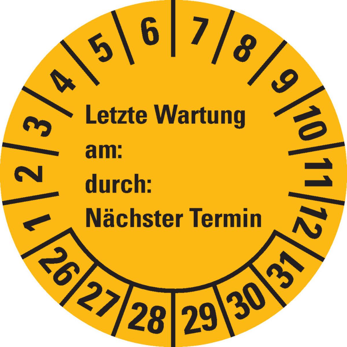 Auswahl: Prüfpl.Letzte Wart., am, durch, Nächste Prüf.26-31, gelb, Dokufolie, Ø30mm, 18/BOG
