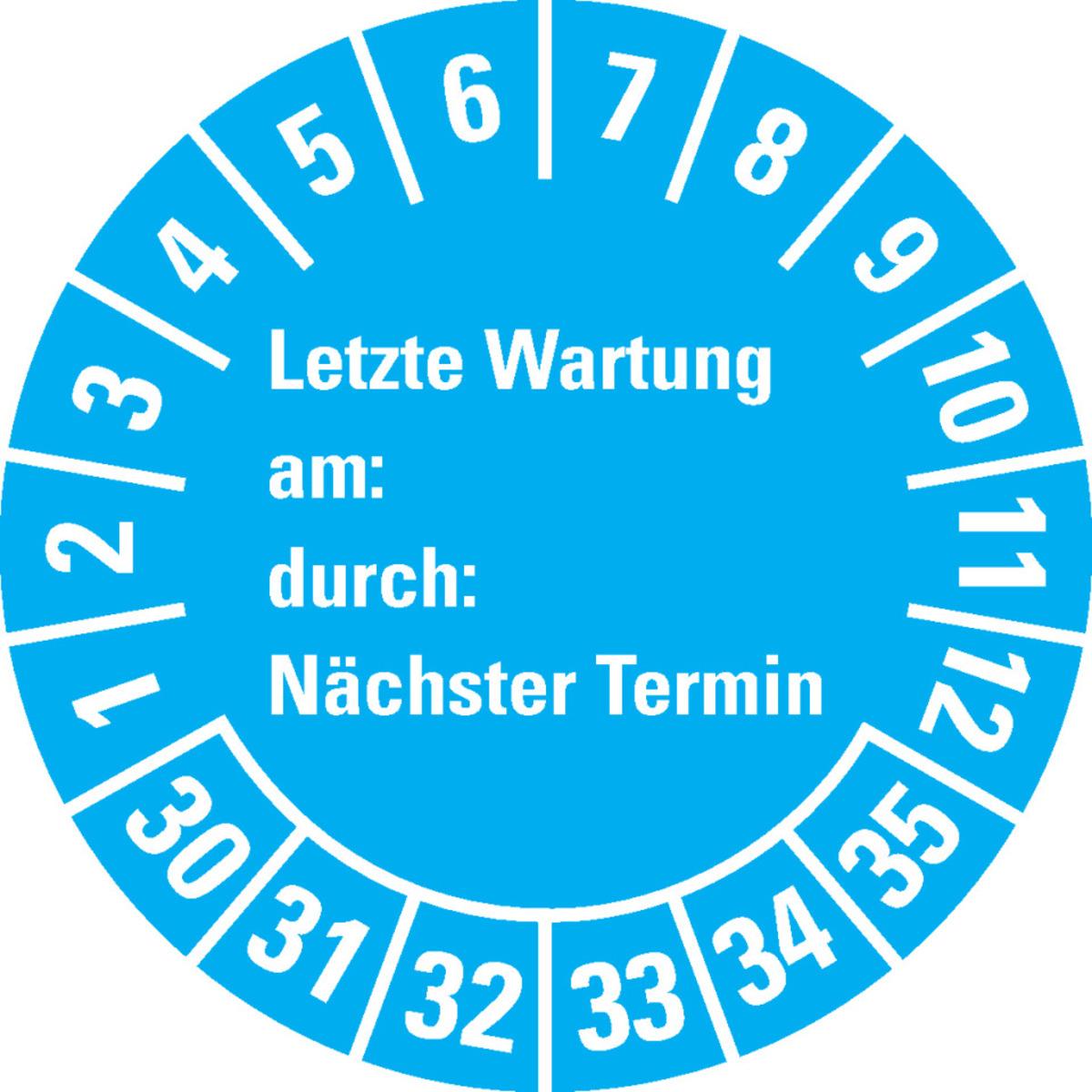 KSIGN Mehrjahresprüfplakette Letzte Wartung, am:, durch:, Nächster Termin Ø 30 mm Dokumentenfolie Bogen