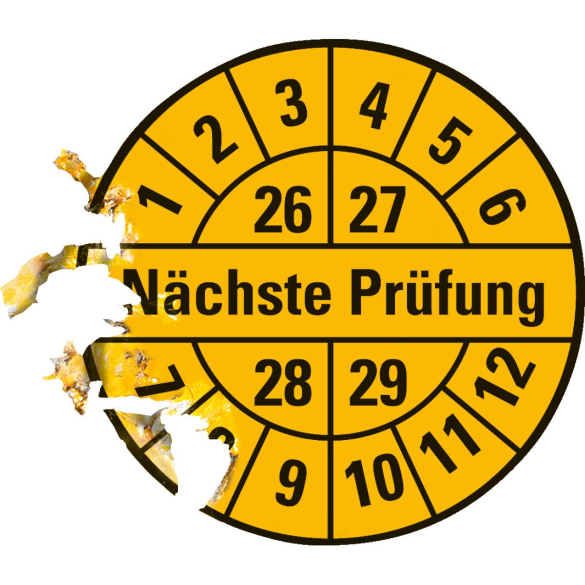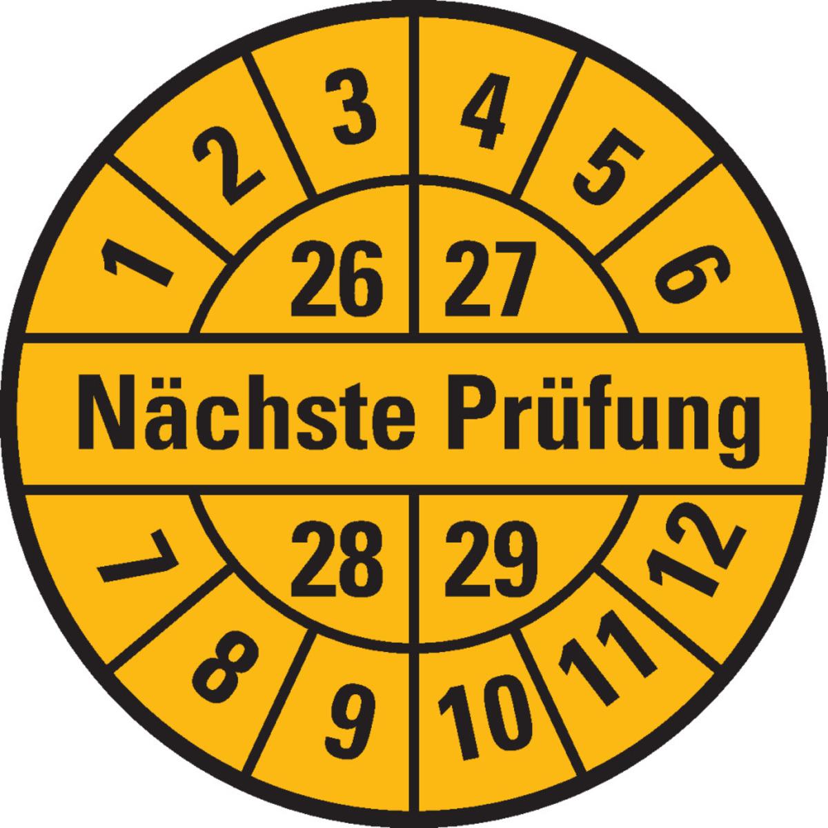 Mehrjahresprüfplakette "Nächster Prüftermin" zur Einhaltung von Prüffristen und Erleichterung der Terminkontrolle.