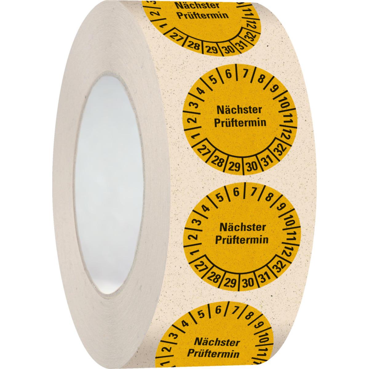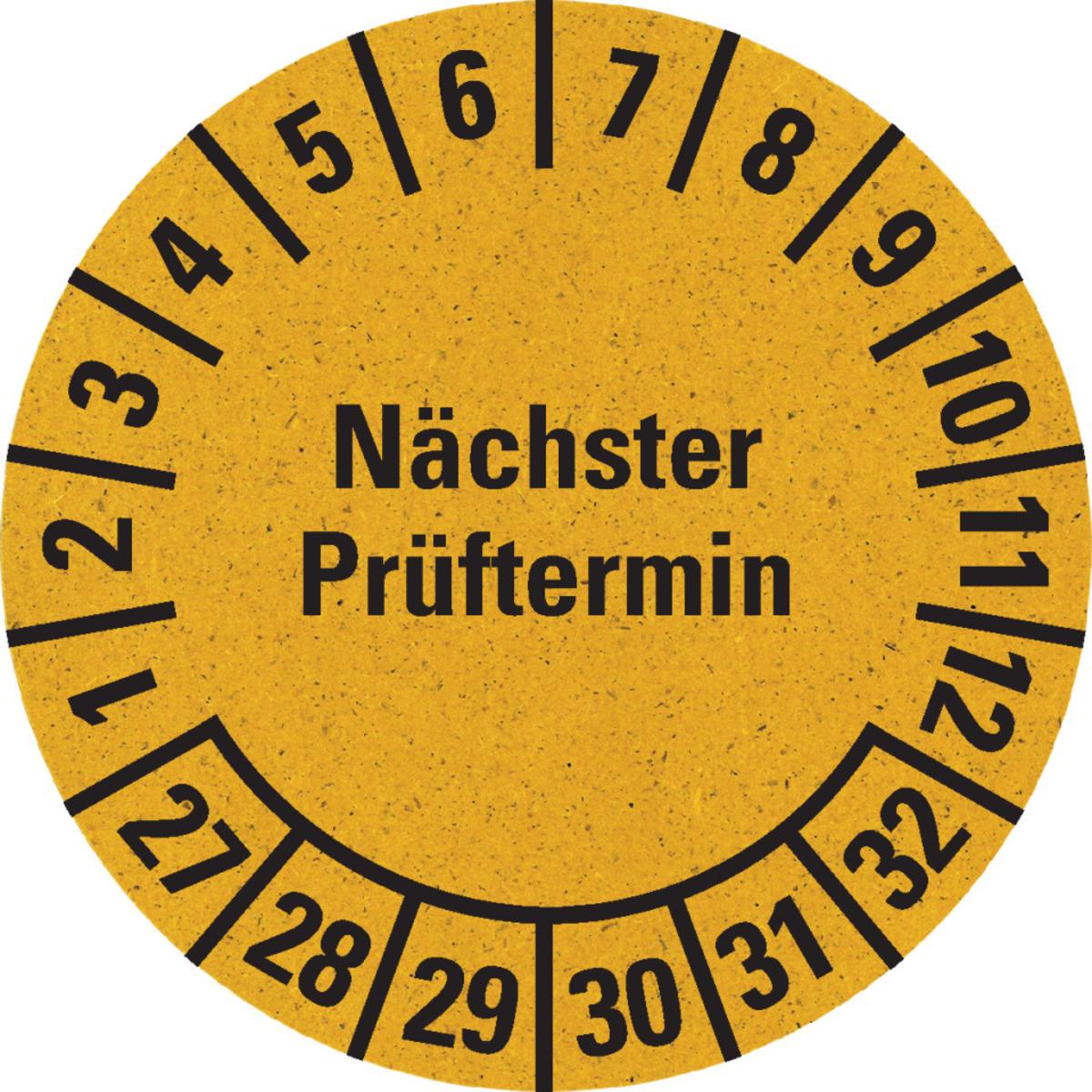 Auswahl: Prüfplakette Nächster Prüftermin 27-32, gelb, Primärfaser-Graspapier, Ø 30mm, 500/RO