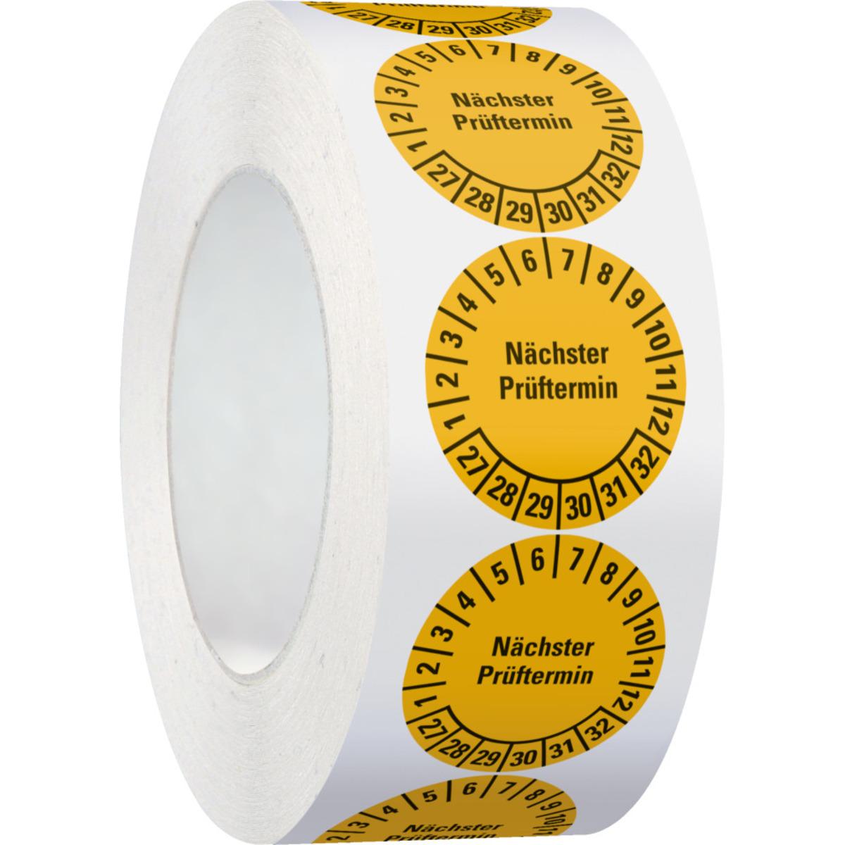 Auswahl: Prüfplakette Nächster Prüftermin 27-32, gelb, Folie, ablösbar, Ø 35mm, 500/Rolle