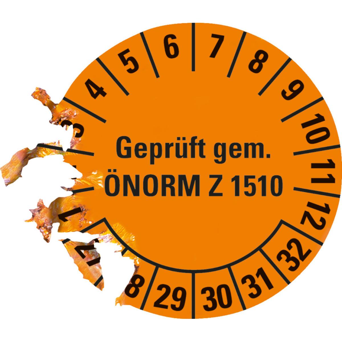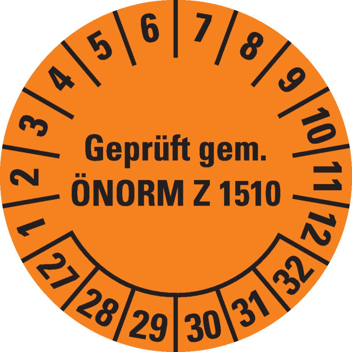 Auswahl: Prüfplakette Gepr.gem.ÖNORM Z 1510, 27-32, orange, Dokumentenfolie, Ø30mm, 18/Bogen