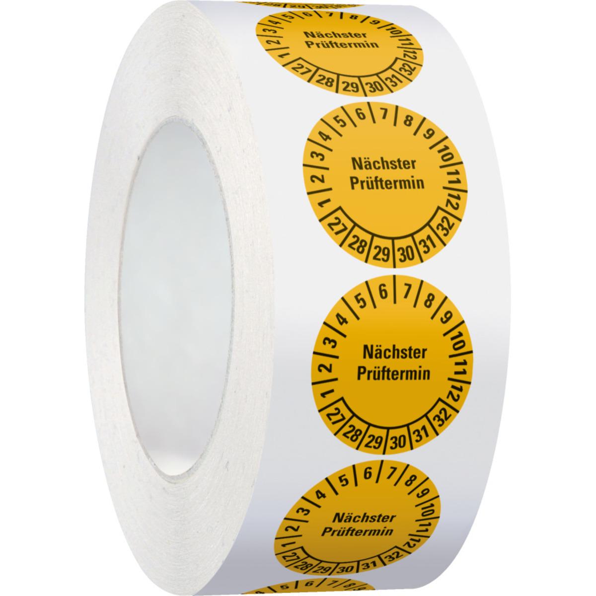 Auswahl: Prüfplakette Nächster Prüftermin 27-32, gelb, Dokumentenfolie, Ø30mm, 1250/Rolle