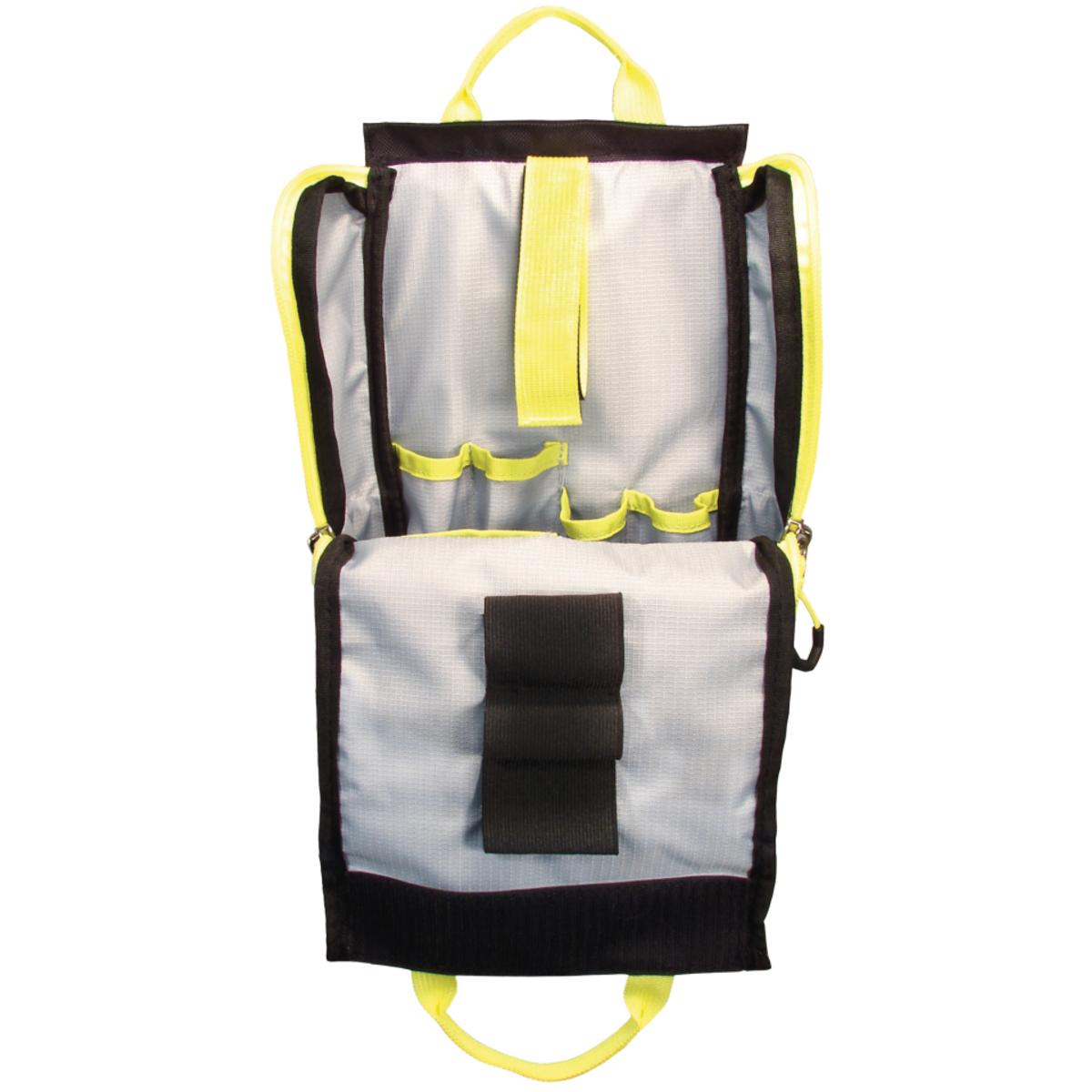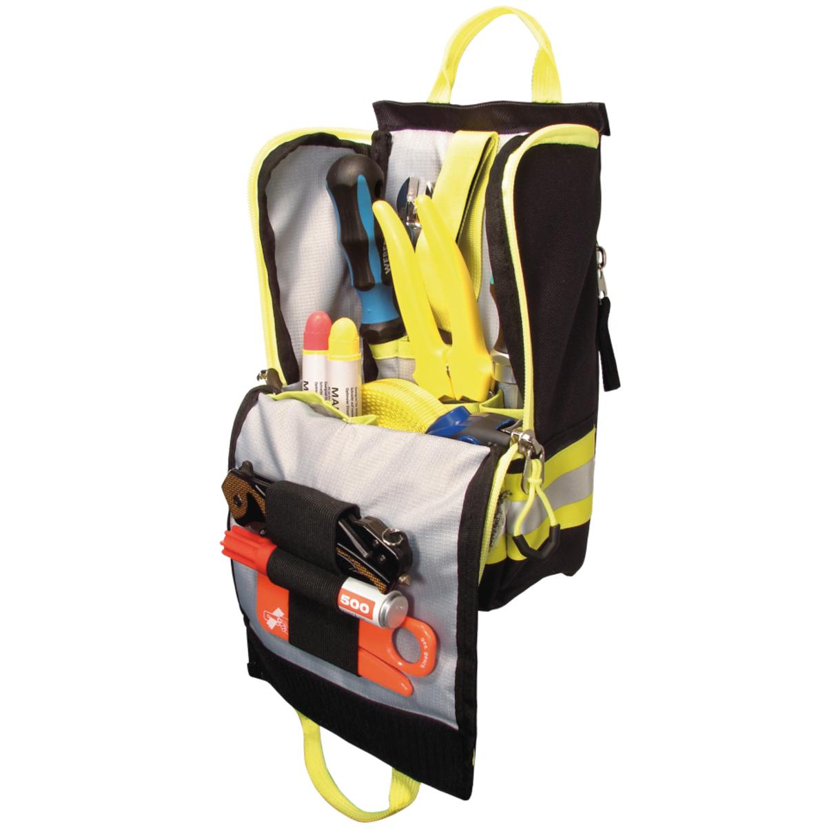 2 Entwässerungsöffnungen im Boden, 7 Einsteckfächer, eingenähte Magnete zur schnellen Befestigung an magnetischen Untergründen, Elastikschlaufen, geräumiger Innenraum, Griffschlaufen, Klettflausch, Klettlaschen, Reflexstreifen