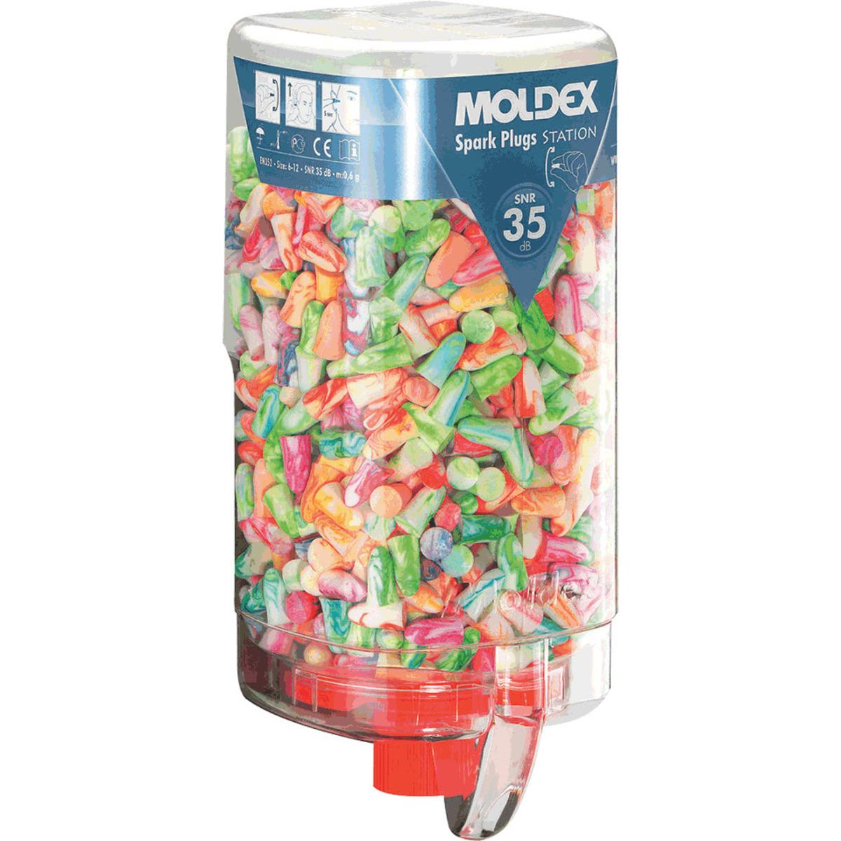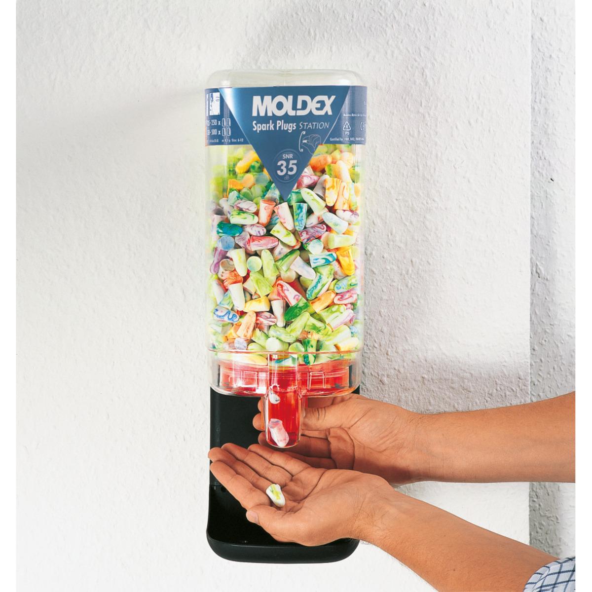 Farbige Gehörschutzstöpsel Moldex SPARK PLUGS aus weichem Schaum mit leicht taillierter Form für hohen Tragekomfort, schützen zuverlässig und druckfrei gegen Lärm, im praktischen Wandspenderaufsatz für einfaches und hygienisches Entnehmen der Stöpsel, einfach Aufsatz in die Wandhalterung einsetzen, Wandhalterung separat mitbestellen