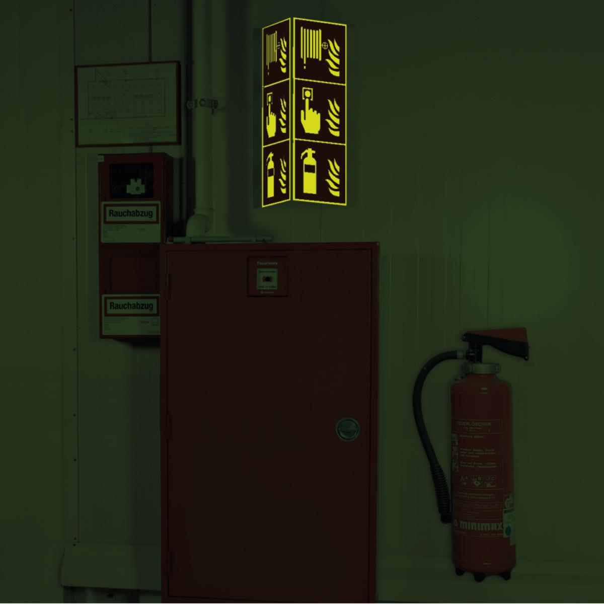 Lang nachleuchtendes 3-fach Nasenschild mit drei verschiedenen Piktogrammen übereinander zur Kennzeichnung von Notfalleinrichtungen, an denen sowohl ein Feuerlöscher als auch ein Brandmelder sowie ein Löschschlauch zu finden sind