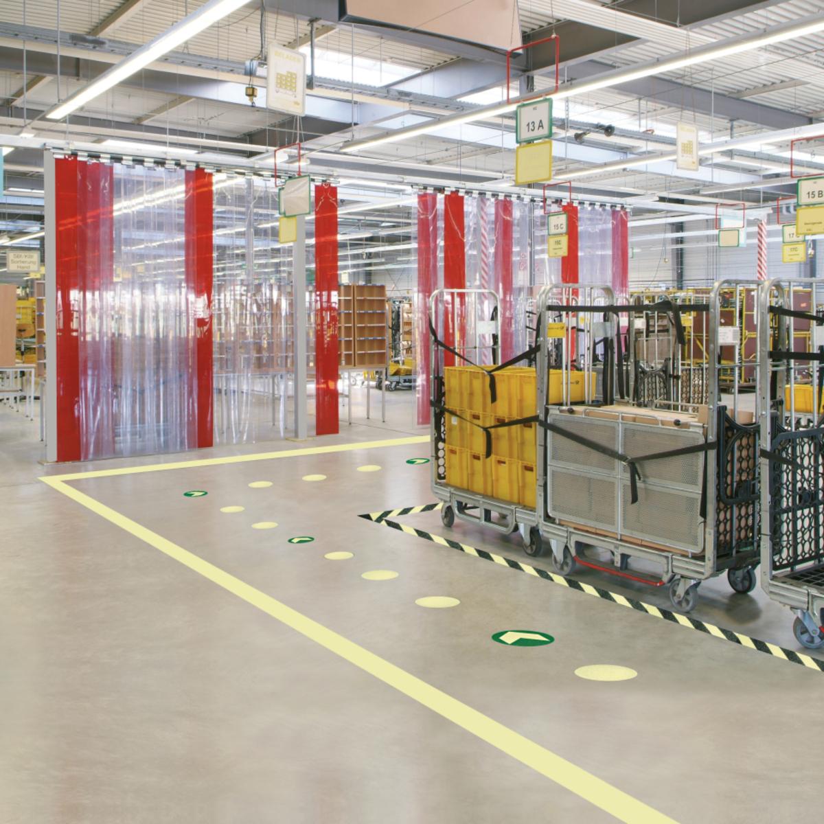 Lang nachleuchtendes, schraffiertes Warnmarkierungsband in PERMALIGHT® Qualität zur Kennzeichnung von beweglichen oder feststehenden Hindernissen, für den Innen- und (temporären) Außeneinsatz, selbstklebend und leicht zu verlegen